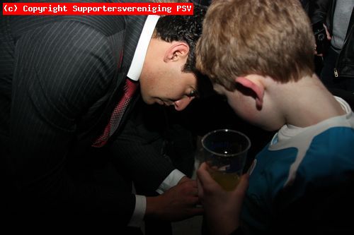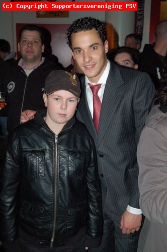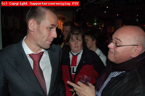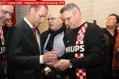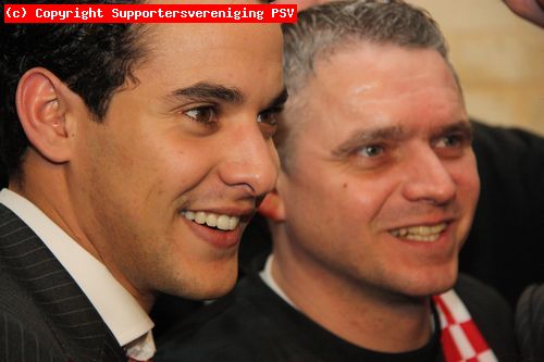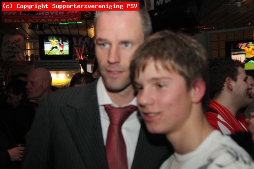 Otman Bakkal en Andre Ooijer waren de bezoekers aan het Supportershome na afloop van de gewonnen wedstrijd tegen NEC. Samen met de in grote getale aanwezig PSV fans in het home vierden zij de terechte overwinning.